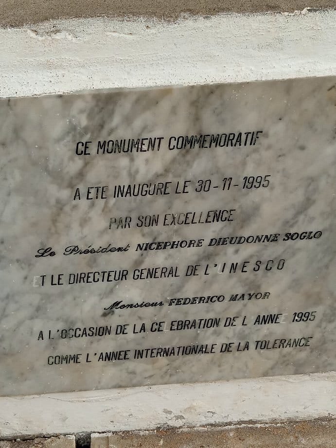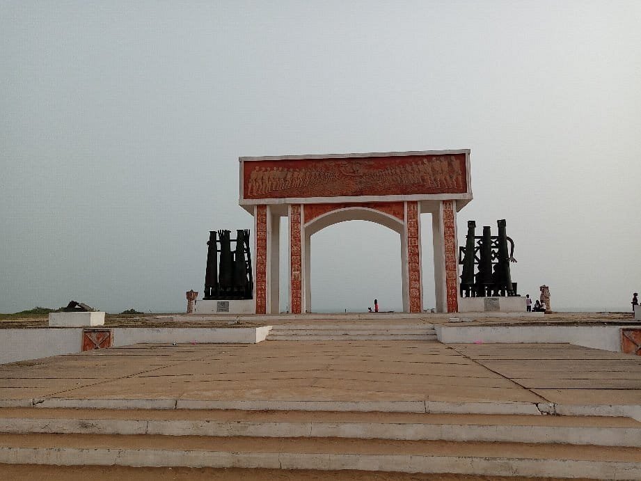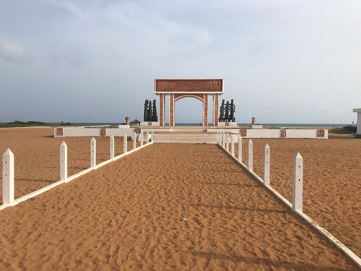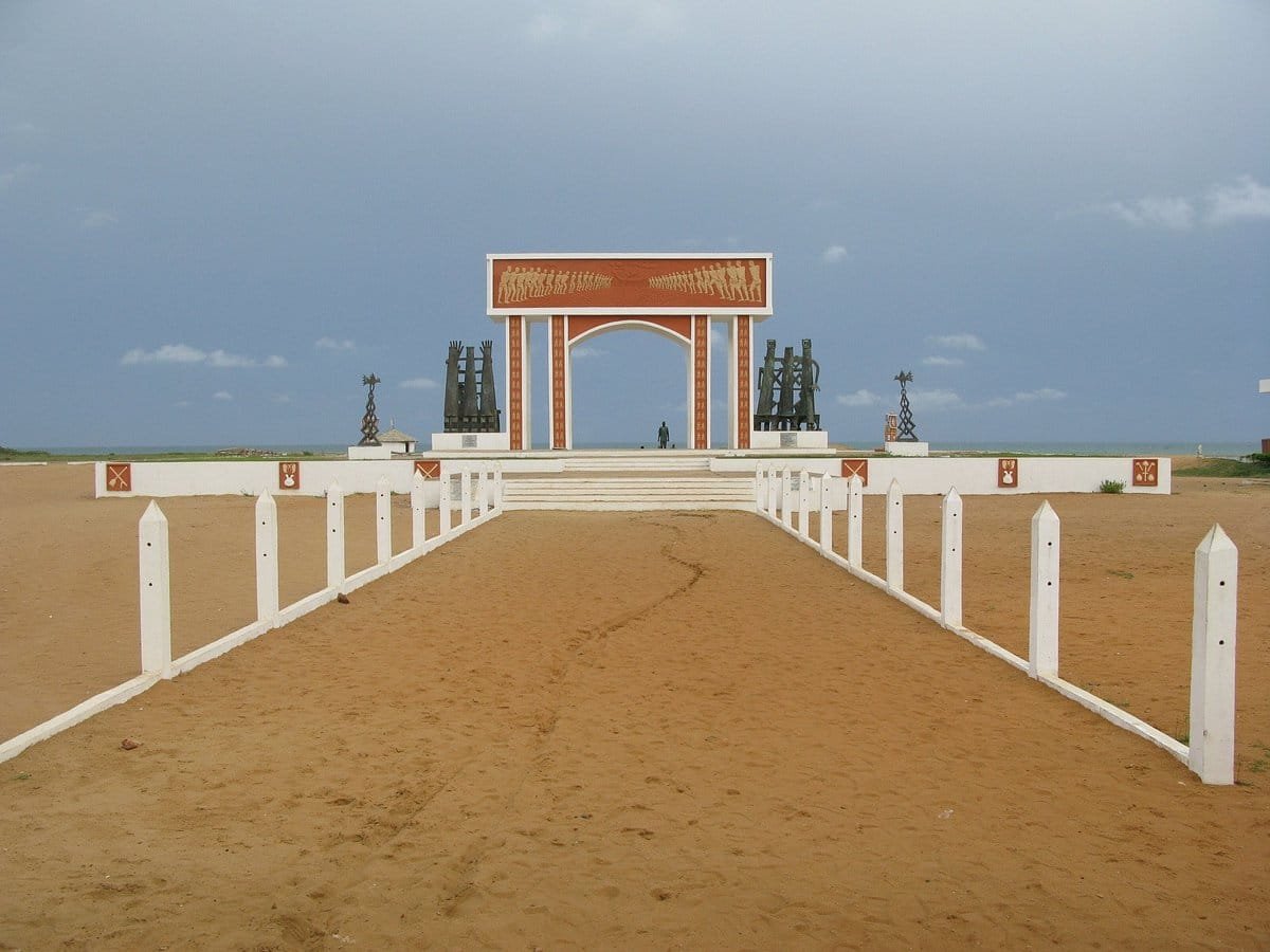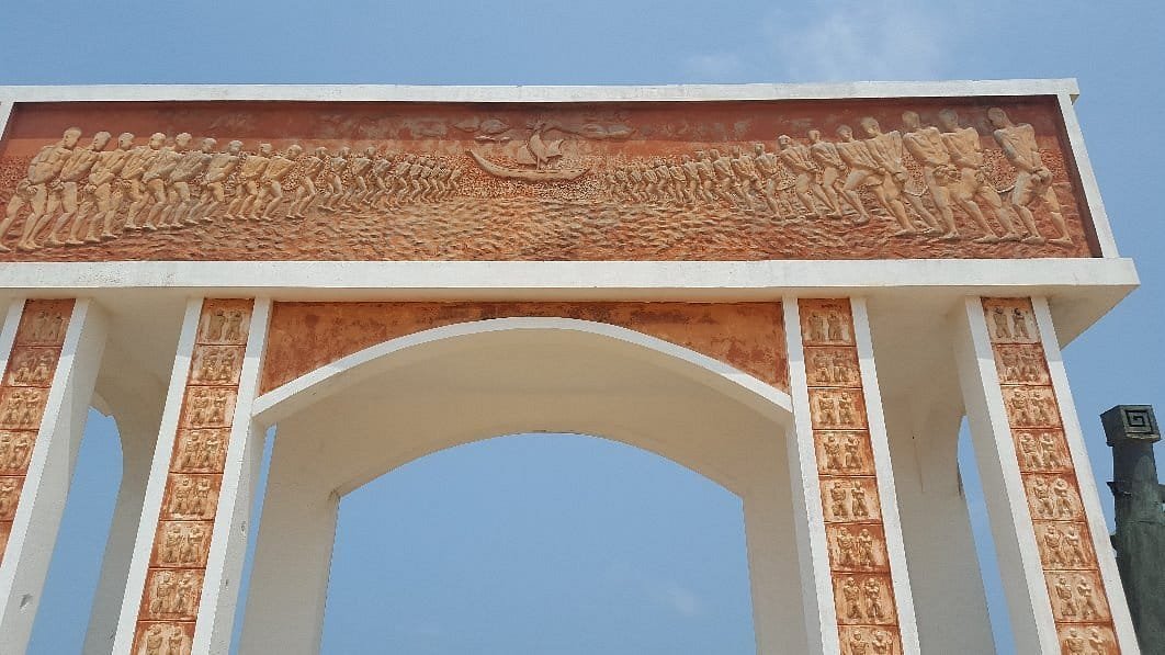 En 1995 , l'Unesco a fait ériger ce mémorial en forme d'arc bordé de sculptures témoignant des nombreux esclaves qui sont passés ici au nombre de plus d'un million .